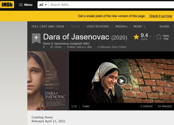 Trenutno, "Dara iz Jasenovca", film koji će tek biti prikazan u domaćim bioskopima u aprilu ove godine, već ima ocenu 9,4!