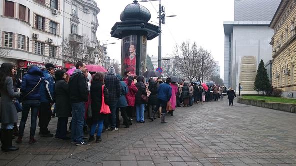 Još pre 10 red se protezao oko 100 metara duž Ulice Kralja Milana i posle niz Resavsku kod Studentskog kulturnog centra. Svi su strpljivo čekali sa kišobranom i odštampanim repertoarom u ruci. Većina ljudi želela da je da iskoristi popust i kupi više ulaznica, ali su mogli da uzmu samo dve po izvođenju, kako bi svi zainteresovani stigli do karata za makar jednu predstavu.