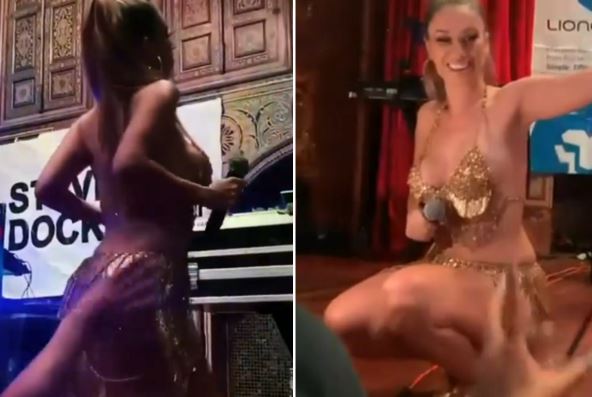 Pevačica je bila obučena u zlatni top koji je jedva pokrio silikonske grudi i zlatnu mini suknjicu koja je pretila da otkrije sve kada je zamešala kukovima.