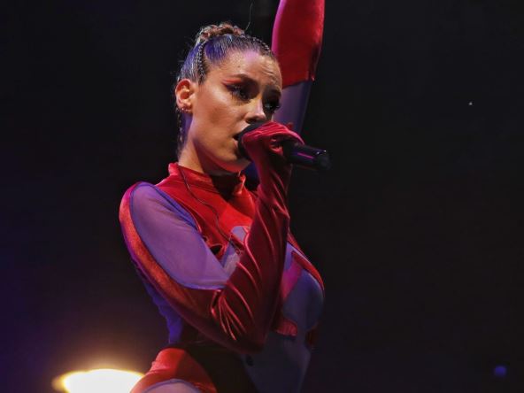 Pevačica je pozirala u zlatnom korsetu koji je istakao njenu liniju i grudi, dok je preostale delove tela pokrila gaćicama i vcrnim čarapama koje su naglasile njene vitke i duge noge.