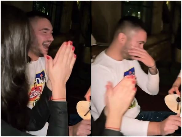 Oni su bili veoma raspoloženi, provodili su se uz prijatelje i vino, a beba je ostala kod kuće. U jednom trenutku stiglo je i iznenađenje za Mirka, tortica sa svećicom, a on je bio van sebe od sreće.