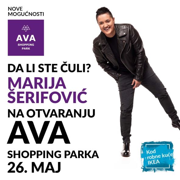 Novo mesto za kupovinu i zabavu, AVA Shopping Park otvara se 26. maja, pored robne kuće Ikea, a sve posetioce zabavljaće hor Čarolija, Ana Lazarević, originalna ekipa populanih TAPovaca, a za kraj naša pobednica Eurosonga Marija Šerifović. Dođite da zajedno sastavimo deliće šarenila, zabave, smeha, novih brendova ili starih, ali na nov način.
