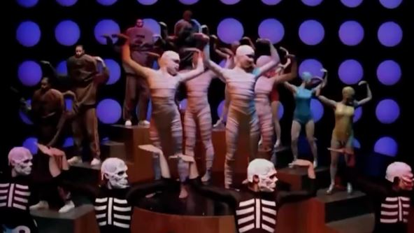 Četiri robota idu u krug i plešu u ritmu vokala, četvorica visokih sportista s malim, plastičnim glavama se penju po stepenicama u ritmu basa, sinhrone plivačice idu drugim stepenicama gore i dole kako klavijatura svira, kosturi su u centru i prate ritam gitare, a četiri mumije plešu u ritmu bubnjeva.