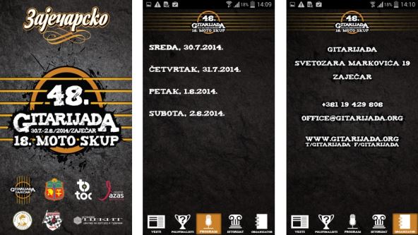 Preuzmite oficijelnu aplikaciju 48. Gitarijade i 18. Moto skupa, koja sadrži vodič kroz festival u vašem džepu, koju je za vas pripremila kompanija Wireless Media kako bi vam olakšala i ulepšala posetu Zaječaru: https://play.google.com/store/apps/details?id=rs.wm.appbuilder.app855&hl=en