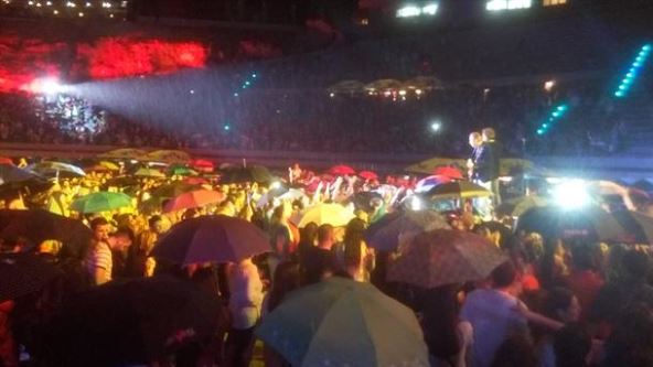 Onda su krenuli da "praše" uz pesmu "Kiše jesenje", a pljusak je uveliko počeo da pada, pa se čitav Stadion šarenio od mnogobrojnih kišobrana. Ritam su usporili uz pesmu "Šteta što je kurva", pa onda kao pandam njoj usledila je "Devojka od milijun dolara"