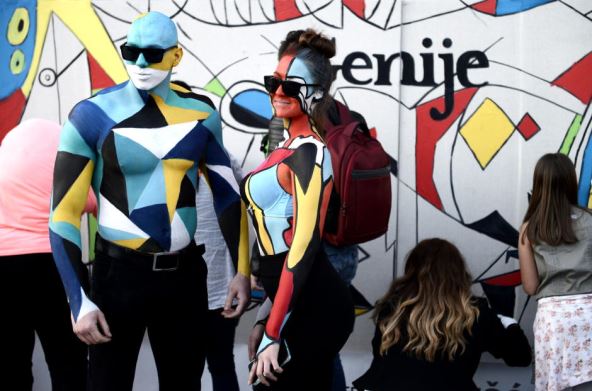 Na platou ispred ulaza, okupljeni su uživali u mini koncertu španske gitarske muzike i imali priliku da i sami kreiraju umetničko delo. Dobro, ne baš sami kreiraju, ali definitivno da ga oboje. Na platnu veličine deset metara kvadratnih bio je oslikan motiv kao sa Pikasovih dela, a svi su mogli da navuku rukavice, uzmu četke i boje u ruke i ofarbaju ga po želji!