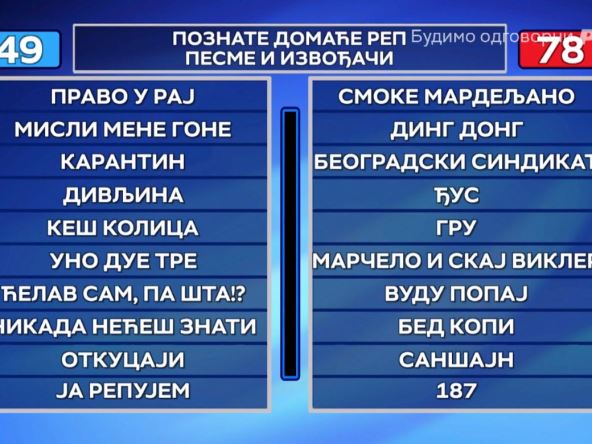 U četvrtfinalnoj emisiji TV kviza Slagalica, gledali smo pobedu crvene takmičarke, stidljive Tamare Tomin, koja je briljirala u igrama Korak po korak i Asocijacije, ali pokazala polovično poznavanje domaće rep scene.