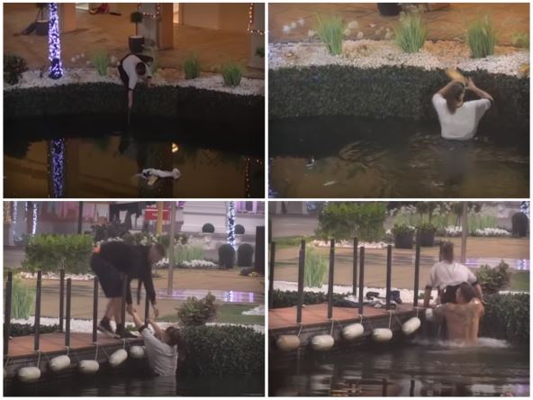 Ona je njihovu zajedničku hranu baci u jezero, a zatim je pokušala metlama i četkama da je izvadi namirnice. Pošto nije uspela, uskočila je u jezero i dohvatila kese koje su plutale.