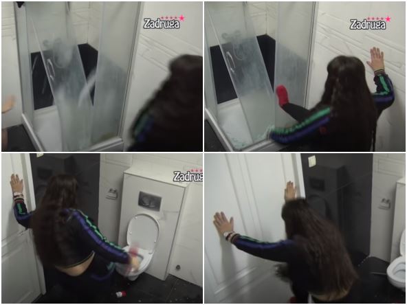 Ona je upala u spoljni toalet i počela da lupa sve pred sobom, prvo je počela od tuš kabine koju je potpuno demolirala, te šutirala i polomila vrata, a staklo je letelo na sve strane.
