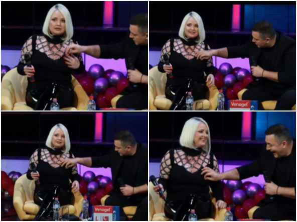 Maja je obukla crnu bluzu sa srebrnim detaljima od grudi do vrata, a izgleda da je imala nešto što je trebalo da se očisti, kada je voditelj rado priskočio u pomoć.