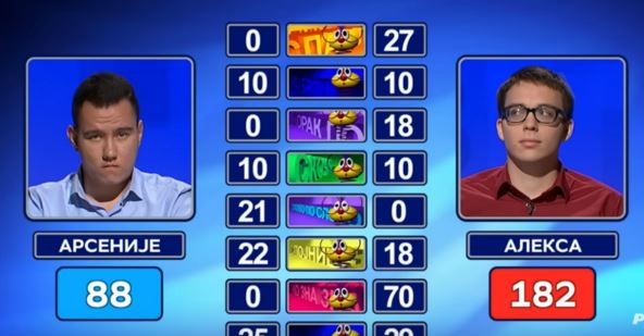 Suparnici u kvizu znanja su suparnici i kada je reč o srpskim klubovima, što je postalo očigledno u igri "Skočko", kada je Arsenije pokušao da da rešenje kolone i rekao: "zvezda, zvezda, karo, karo". Kada je red došao na Aleksu rekao je "Da odgovorim kolegi" i rekao svoju kombinaciju: "herc, herc, zvezda, zvezda".