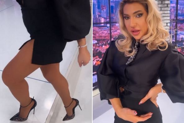 Dok je pričala s gostima, gledaoci su mogli da vide crnu košulju, suknju i potpetice, ali zato su, kada su otišli na njen Instagram da vide šta je radila tokom reklama, mogli da vide poziranje, manekenski hod, da je šlic na miniću skoro do kuka, da su potpetice tanke i visoke, ali i da se jedno dugme na uskoj košulji otkopčalo.