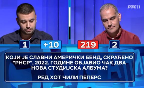 Plavi i crveni takmičar su dobili pitanje "Koji je slavni američki bend, skraćeno PHCP, 2022. godine objavio čak dva nova studijska albuma?".