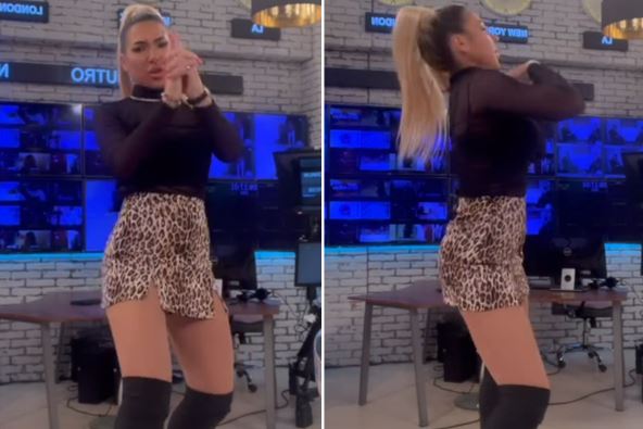 Jovana je nosila i minić tigrastog printa, ali i čizme do pola butina. U toku reklama ponovo je uključila kameru na telefonu i snimala se dok pleše. Pogledajte: