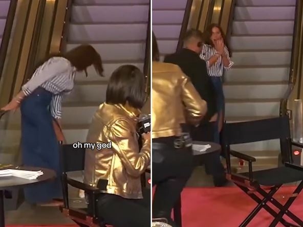 Kako se spuštala samouvereno niz njih, zakoračila je na tlo, a kada se okrenula štikle su se zaglavile u stepenicama, a onda su blokirale i njih. U studiju je nastala prava pometnja i smeh, a voditeljka je ustala gledajući u neverici šta se događa pred njenim očima.