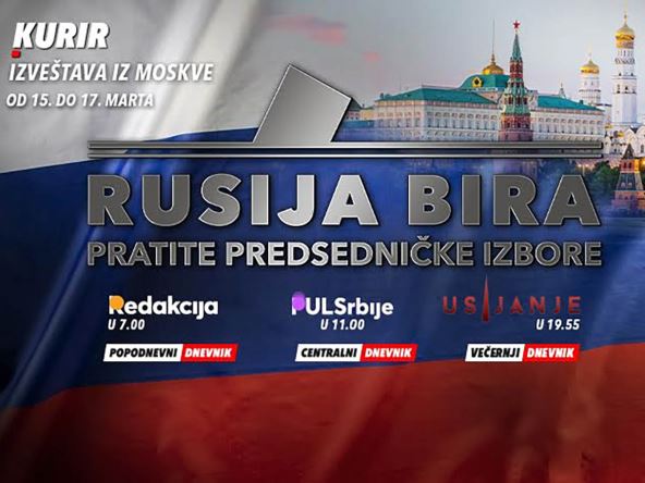 Gledaoci Kurir televizije imaće priliku da prate sva najnovija dešava i iz minuta u minut, budu informisani i upoznati sa svim detaljima izbora u Rusiji u emisijama "Redakcija" od 7 časova, "Puls Srbije" od 11 časova i specijalno izdanje emisije "Usijanje" od 19.15 časova, kao i u Centralnom, Popodnevnom, Večernjem dnevniku i Brzim vestima.