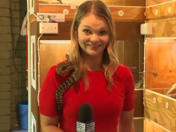 Voditeljka australijske televizije hit je na netu, zbog videa u kojem priča u kameru dok joj je na ramenu zmija koja napada.