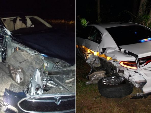 "Tesla" se zakucao u patrolu toliko jako, da je oštetio oba policijska vozila.