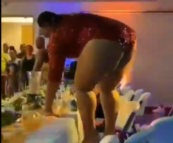 Uz taktove čuvene svadbarske pesme "Danas majko ženiš svoga sina" skočila je na sto, ali se već sledećeg trenutka našla na podu sale kada se on i prepolovio.