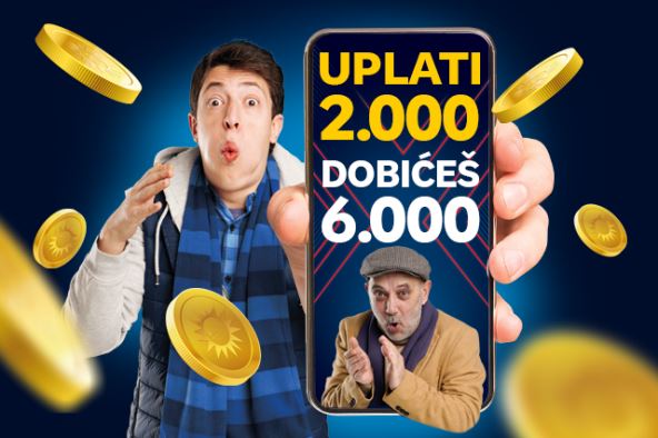 Svaki novoregistrovani igrač, po uplati od 2.000 ili više dinara, dobiće tri puta po 2.000 dinara Bonusa dobrodošlice! Ono što je osobeno za ovu akciju je činjenica da se bonusi otključavaju brzo i lako u samo nekoliko koraka.