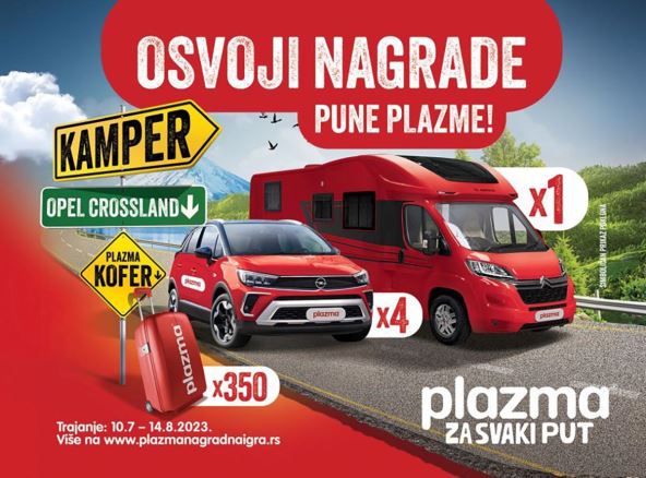 Kao dosledni saputnik svakog putovanja u periodu od 10. jula do 14. avgusta 2023. godine Plazma nagrađuje svoje verne potrošače nagradama punim Plazme. Pored glavne nagrade fantastičnog Plazma kampera Coral Axess 650, dobitnike svaki dan očekuje 10 Plazma kofera, dok će četiri srećna dobitnika osvojiti Opel Crossland automobil.