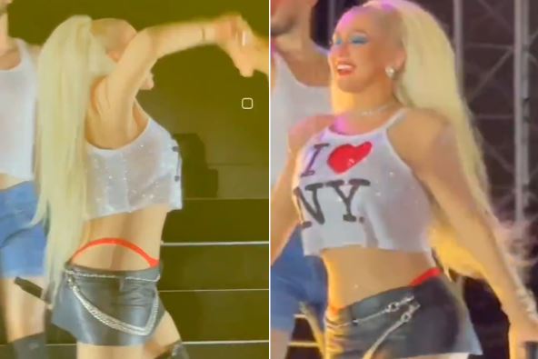 To je uradila pevačica Kristina Agilera, koja je na poslednjem koncertu pokazala ravan stomak, crvene tange koje vire iz minića, pirsing na pupku i... šav sa strane!