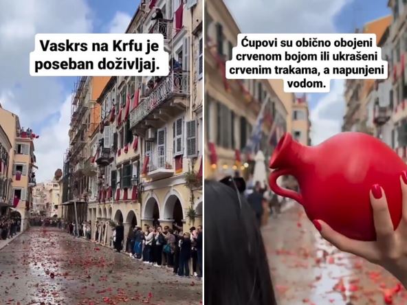 Jedna korisnica na Instagramu pokazala je kako se slavi najradosniji hrišćanski praznik na Krfu. Uz dosta galame i vreve ljudi, bacaju se ćupovi sa terasa i balkona, čak i oni najvećih dimenzija. Ali, ne bilo kakvih - oni moraju biti crvene boje!