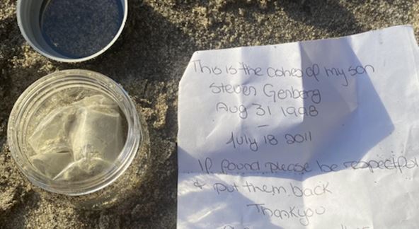 U pismu je stajalo: “Ovo je pepeo mog sina Stivena Genberga (31. avgust 1998 - 18. jul 2011). Ako ga pronađete, budite dobri i vratite ga nazad. Hvala vam. Ožalošćena majka”.