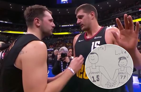 Dončić se potom oprašta od Jokića, koji se trudi da zauzda emocije, a onda Luka primećuje crtež srpskog košarkaša