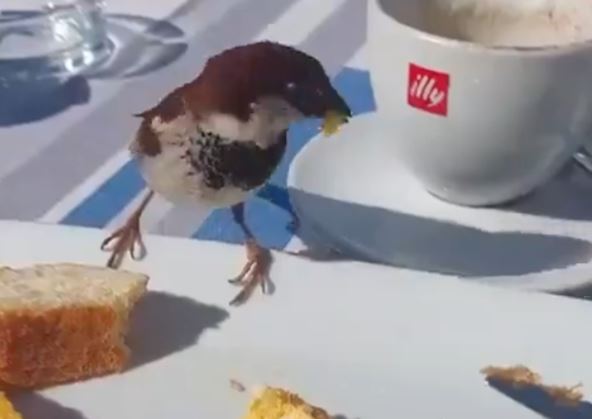 Par prijatelja je izašlo na kafu i doručak i selo u baštu restorana. Pri kraju obroka, na sto su sletela dva vrapca, a jedan je hrabro od gostiju za stolom uzimao mrvice hrane, i potom skakutao do "njegove devojke" kako bi je nahranio.