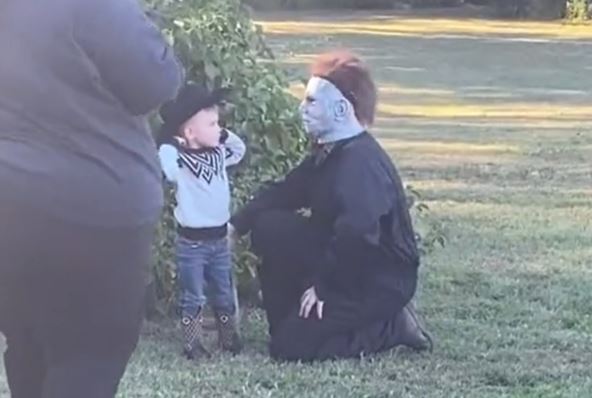 Kako se vidi na viralnom snimku o kom ljudi ne prestaju da bruje, ispred mališana u kaubojskom kostimu je stao lažni Majkl Majers, koji ga je potom dotakao po ramenu krvavim nožem.
