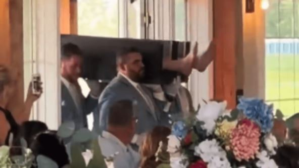 Snimak koji je na društvenim mrežama pogledalo skoro četiri miliona ljudi, prikazuje nekoliko momaka identično odevenih u plava odela, koji na ramenima nose kovčeg iz kog vire samo bose noge koje se pomeraju u ritmu muzike. Dok su prolazili pored zvanica, đuskali su, a onda se u jednom trenutku mladoženja podigao iz sanduka.