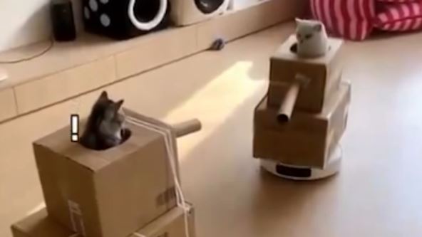 Od kartonskih kutija je napravio tenkove, "uposlio" je rumbe da glume gusenice koje ih pokreću, a potom u svaku od kutija-tenkova, stavio po jednu mačku.