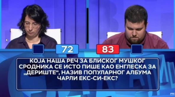 Pitanje je glasilo: "Koja naša reč za bliskog muškog srodnika se isto piše kao engleska za "derište", naziv popularnog albuma Čarli Eks-Si-Eks?".