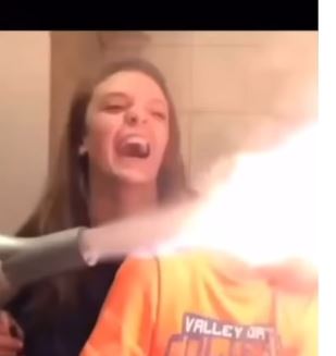 Da stvar bude još gora, ona je u napravu stavila nešto nalik bebi puderu ili brašnu, a fen se u jednom trenutku zapalio i zahvatio njegovu kosu, što je kamera zabeležila.