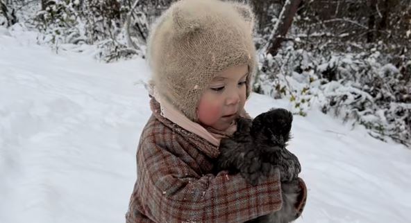 Dok šeta po snegu, ona se trudi da i kokoški ne bude hladno, te je čvrsto drži u svom naručku, a ni ona se ne buni.