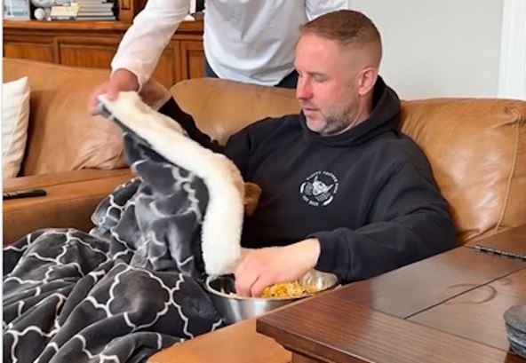 Na snimku ga vidimo kako sedi zavaljen u kožnoj sofi i gleda Netfliks. U jednoj ruci mu je činija čipsa, a u drugoj... krava!