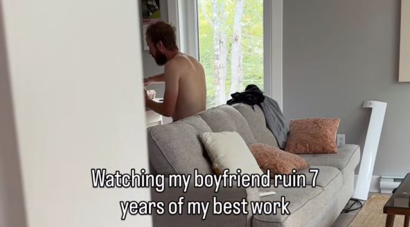 "Ono kad gledaš svog dečka kako uništava sedam godina mog najboljeg posla za dva minuta", napisala je devojka, a potom dodala i šta njihov ljubimac misli: "Tata me je naterao".