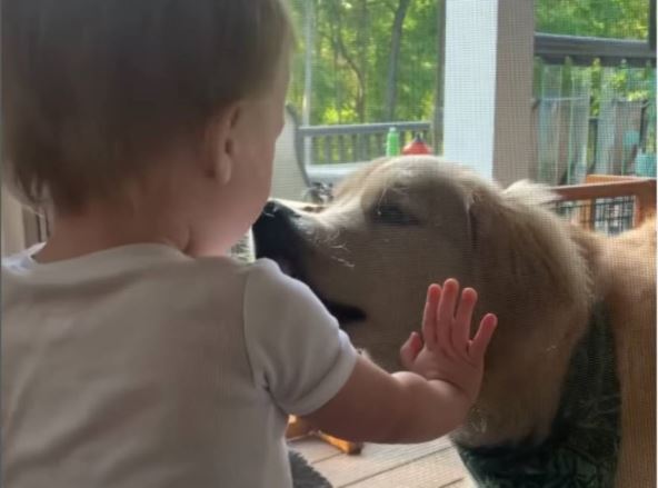 Dok se dete smeje i poskakuje s unutrašnje strane, pas s dvorišta pokušava da ga “poljubi”, lizne ili lagano “ugrize” kroz staklo, ne shvatajući da ga providna barijera sprečava u tome. Njegovi pokušaji deluju beskrajno simpatično: njuška mu klizi niz staklo, šape nežno dodiruju površinu, a rep ne prestaje da maše.