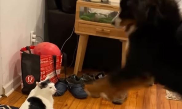 Video koji je za kratko vreme osvojio društvene mreže i premašio milion pregleda pokazuje koliko susret psa i mačke može biti zabavan i pomalo napet.