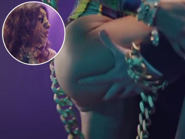 Katarina u spotu pleše s muškarcem - pretpostavljamo "robovlasnikom", dok na sebi nosi tange, ali i lance isprepletane preko lica.