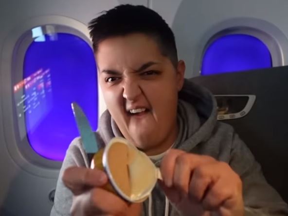 "A sad kreće spektakl. Istina je da letim biznis klasom, zato što imam razne kičmene bolesti i ne mogu da sedim 15 sati... I, obično ono što ide uz biznis klasu su šampanjci, škampi... Ali, ovaj put nešto sasvim drugačije! Na letu se jede PAŠTETA! Nemojte nikada potceniti ovo!", rekla je Marija, a potom uživala u hrani.