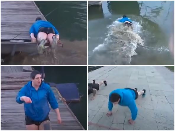 U ovom video snimku Kristijan trči, radi sklekove, čučnjeve, a u jednom trenutku i skače u ledenu Savu. Dok su ljudi oko njega umotani u jakne, šalove i sa kapama na glavi on u šorcu pliva u reci.