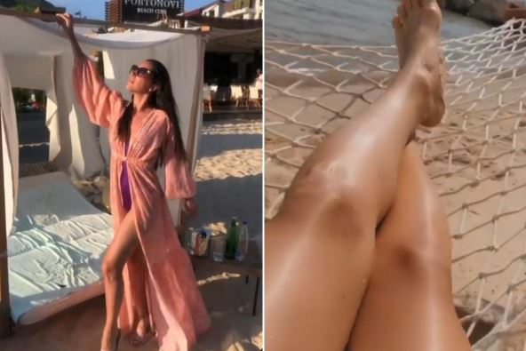 Sada je objavila nove klipove, na kojima vidimo da uživa u pogledu, uživajući na pletenoj ljuljašci dok sunča duge noge.