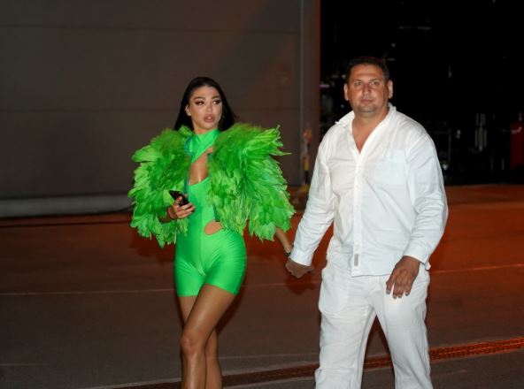 Ona se u izazovnoj kombinaciji pojavila na imanju u Šimanovcima - u uskom kombinezonu sa dubokim dekolteom, preko kog je nosila veliki ogrtač od perja, a mnogi su primetili da se starleta gotovo cele večeri nije odvajala od svog oca Radomira Marinkovića Takija.