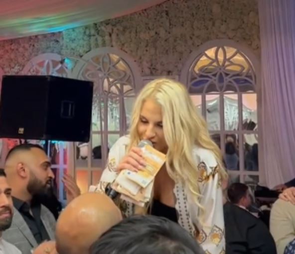 Na snimku vidimo Saru kojoj gosti na jednom slavlju, pored novčanica, u ruke, kao bakšiš, stavljaju i ključeve od kola.