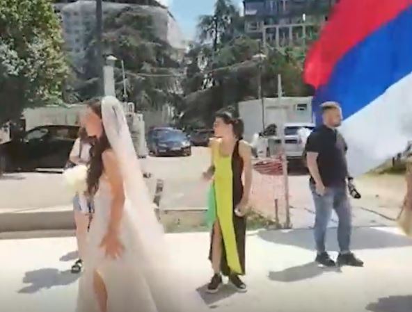 Nina, koja se nedavno porodila, obukla je provokativnu venčanicu, sa izrezom do butina, a veo joj se vukao do zemlje. U ruci je držala buket od belog cveća, a svatovi su je pratili do Hrama s trobojkom.