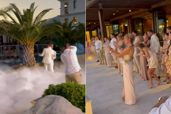 Ona je na svom Instagramu otkrila da par pleše svoj prvi svadbeni ples uz pesmu "Ljubav" koju im je otpevao Sergej Ćetković, uz dim i palme, kao i da su svi svatovi obučeni u bež.