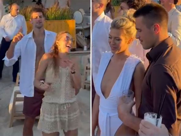 Najveseliji su, pored mladenaca, bili Novak Đoković i njegova supruga Jelena, koji su u opuštenoj varijanti i bosi na plaži igrali i pevali uz Mariju Mikić, koja je porodici ulepšala današnje slavlje.