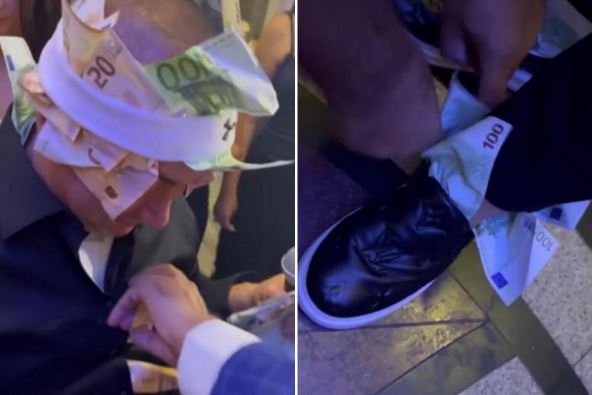 Supruga Marka Gobeljića je na svom Instagram profilu podelila video na kom su Đaniju pune ruke novca, ali i košulja, nogavice od pantalona, pa čak i cipele u koje su svatovi gurali novčanice od 100 evra!